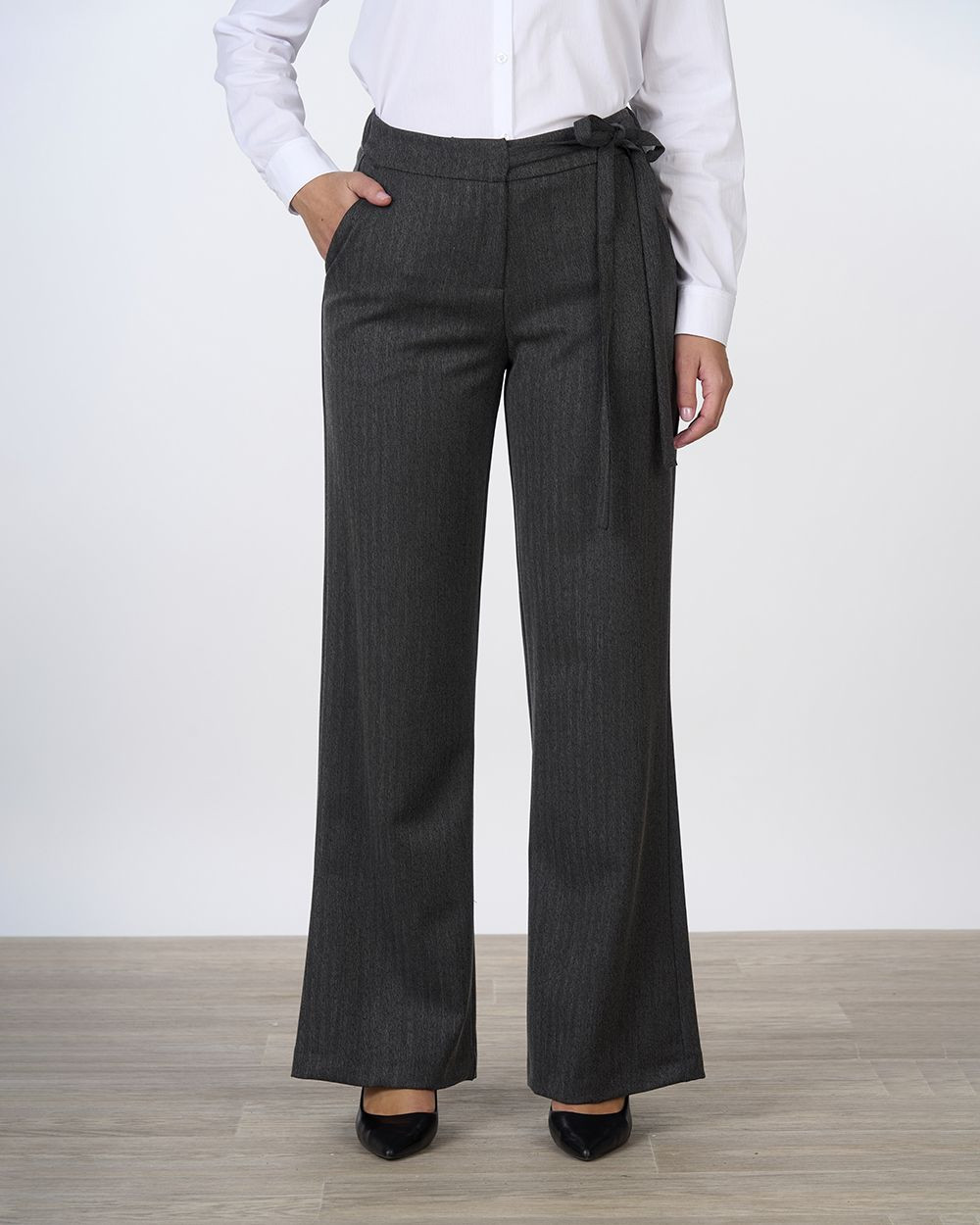 Il design a vita regolare è arricchito dalla cintura laterale da annodare, che sottolinea delicatamente il punto vita, valorizzando la silhouette con femminilità. La gamba ampia e fluida slancia la figura e dona movimento ad ogni passo, rendendo questi pantaloni adatti a molteplici occasioni: perfetti per l’ufficio con una camicia bianca e décolleté, oppure per un look più disinvolto con maglie morbide e sneakers.