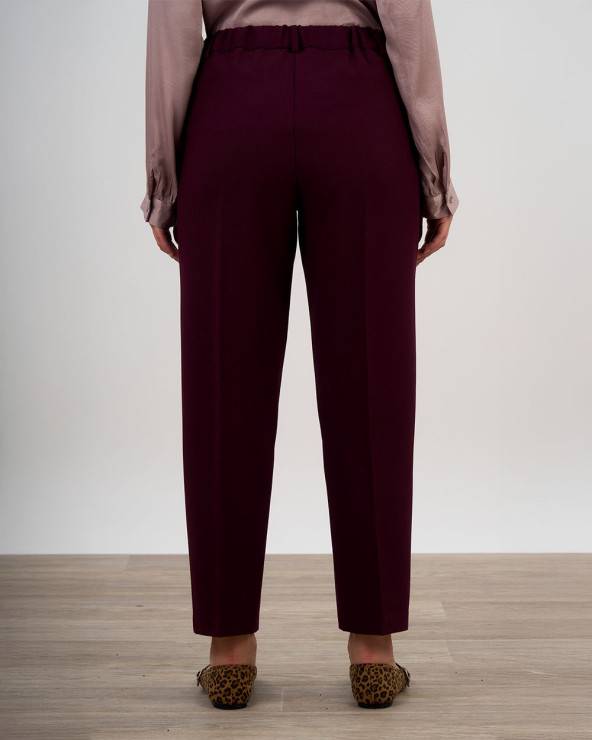 Il modello presenta una linea dritta e pulita, con piega centrale stirata e vita elasticizzata sul retro che garantisce massimo comfort senza rinunciare allo stile. La chiusura frontale con bottone e zip e le tasche laterali donano un tocco sartoriale e raffinato.