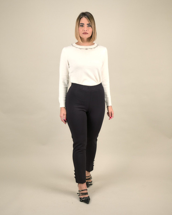 La linea pulita è impreziosita dai bottoni decorativi sul fondo gamba, che aggiungono un tocco raffinato e ricercato. La vita elasticizzata garantisce praticità e libertà di movimento, rendendo questo modello perfetto per ogni momento della giornata.