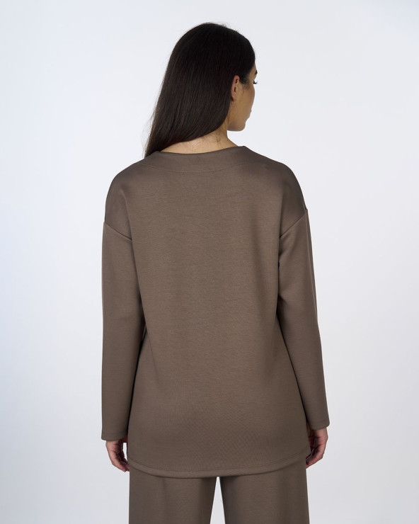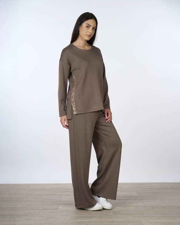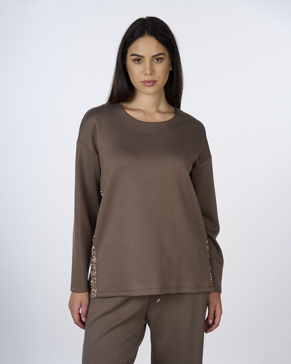 Questa felpa rappresenta l’incontro perfetto tra comodità e dettagli luminosi che fanno la differenza. Realizzata in tessuto morbido ed elasticizzato, assicura una vestibilità confortevole e scivolata, ideale per accompagnare i movimenti con naturalezza. Il design essenziale con scollo rotondo e maniche lunghe viene impreziosito dalle paillettes applicate sui lati, che regalano un tocco di brillantezza e rendono questo capo unico nel suo genere.