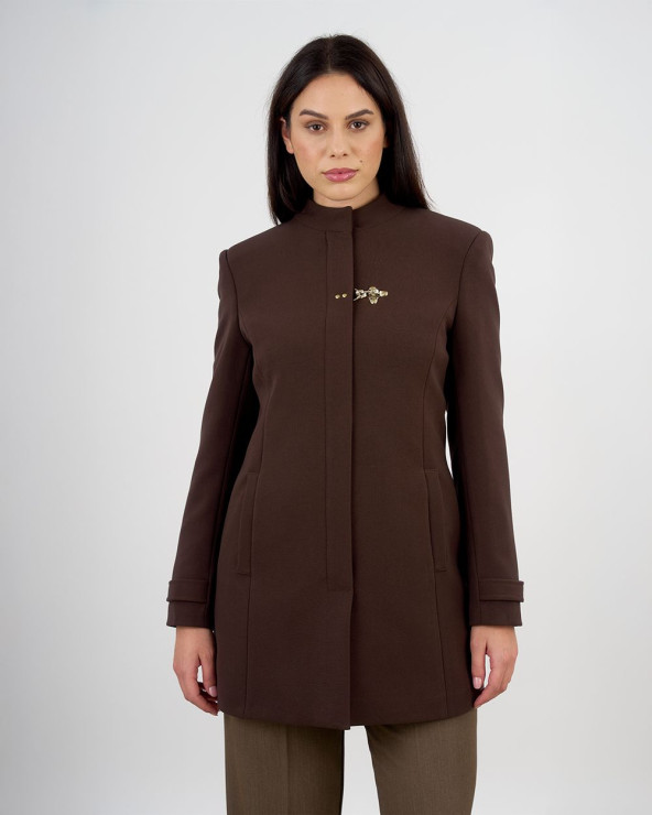 Cappotto elegante con collo alla coreana e chiusura con raffinato gancio gioiello, pensato per la donna che ama uno stile ricercato e...