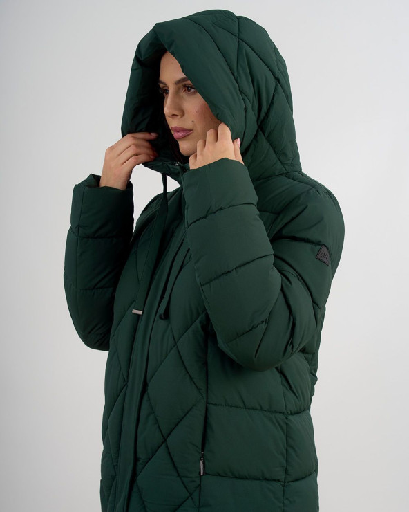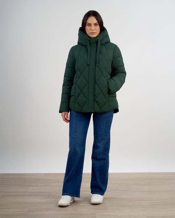 Realizzato in tessuto trapuntato effetto rombo, presenta un ampio cappuccio con coulisse regolabile, chiusura con zip nascosta e tasche laterali con zip.