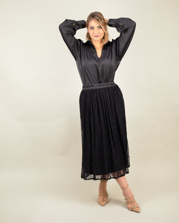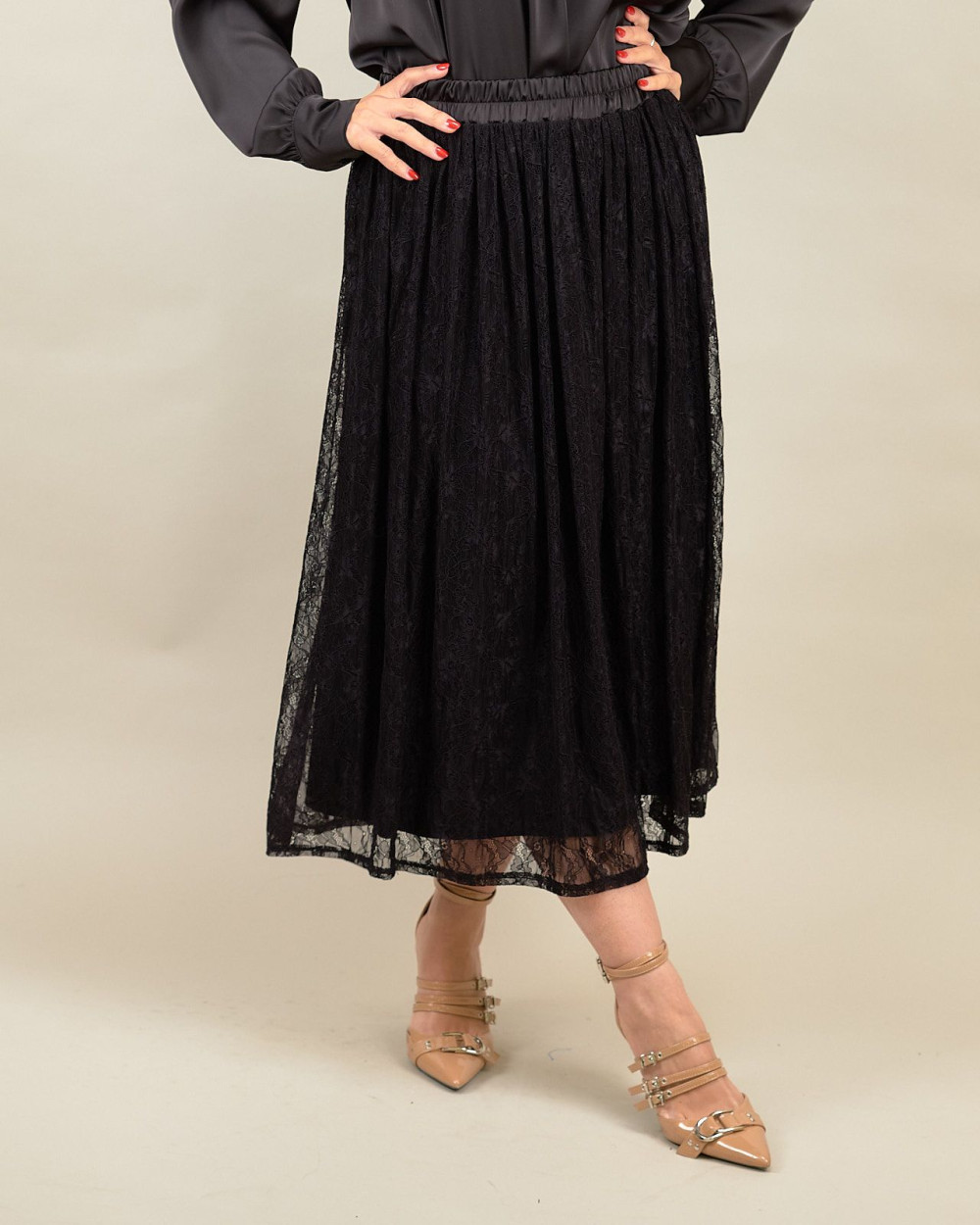 Il pizzo floreale semitrasparente regala un tocco delicato e sofisticato, mentre la lunghezza midi e la fodera interna assicurano discrezione e armonia nelle linee. L’elastico in vita valorizza la silhouette e la rende adatta a ogni tipo di fisicità, mantenendo sempre un’eleganza naturale.