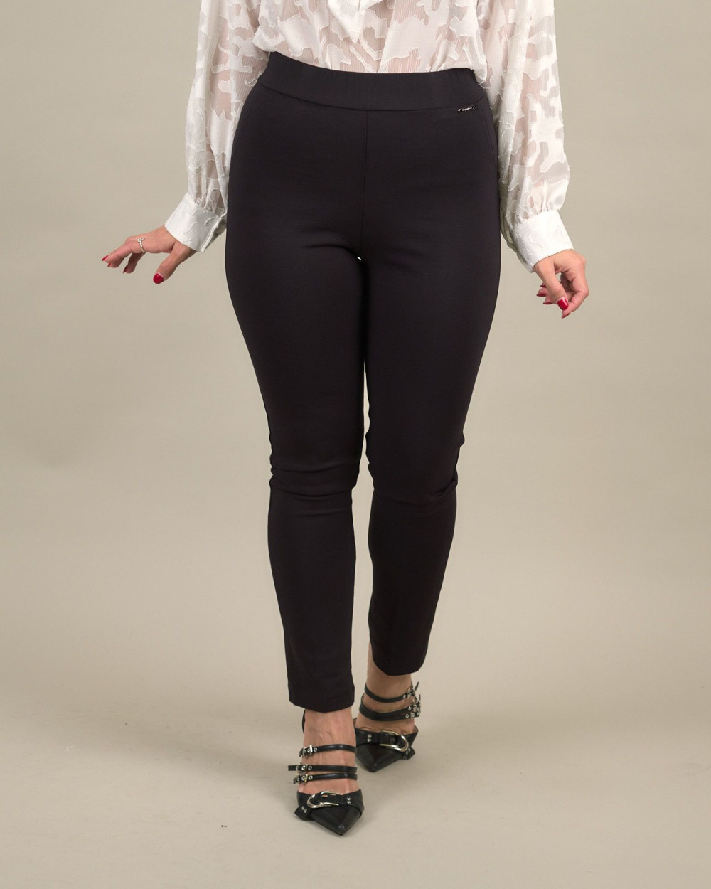 Il modello a vita alta con fascia elasticata assicura comfort e libertà di movimento, mentre la linea affusolata dona un look elegante e moderno, perfetto per ogni occasione — dal lavoro al tempo libero.